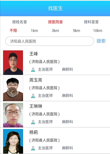 点击"山东医健通"中的"找医生"功能,系统会自动推荐附近3-10千米以内的医师。在医师列表中点击某医师,可查看该医师的执业信息。居民可以根据自身就医需求选择,也可直接用姓名搜索。