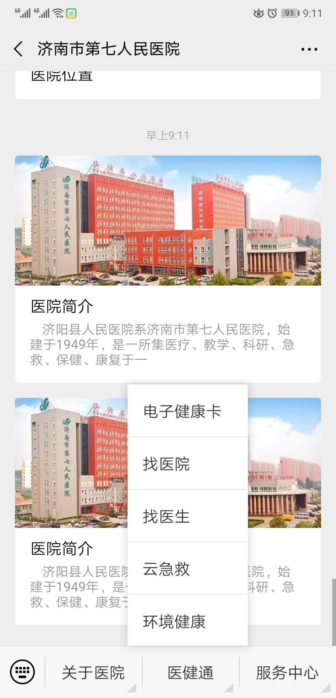 "山东医健通"是政府主导开放的"互联网+"便民惠民服务平台,通过大数据、位置即服务及健康空间智能感知等领先的技术与理念为居民就医提供智能导引。医院微信公众号成功对接后,新增"电子健康卡、找医院、找医生、云急救、环境健康"五大功能,广大用户只需简单几步,足不出户即可享受全面的医疗服务。