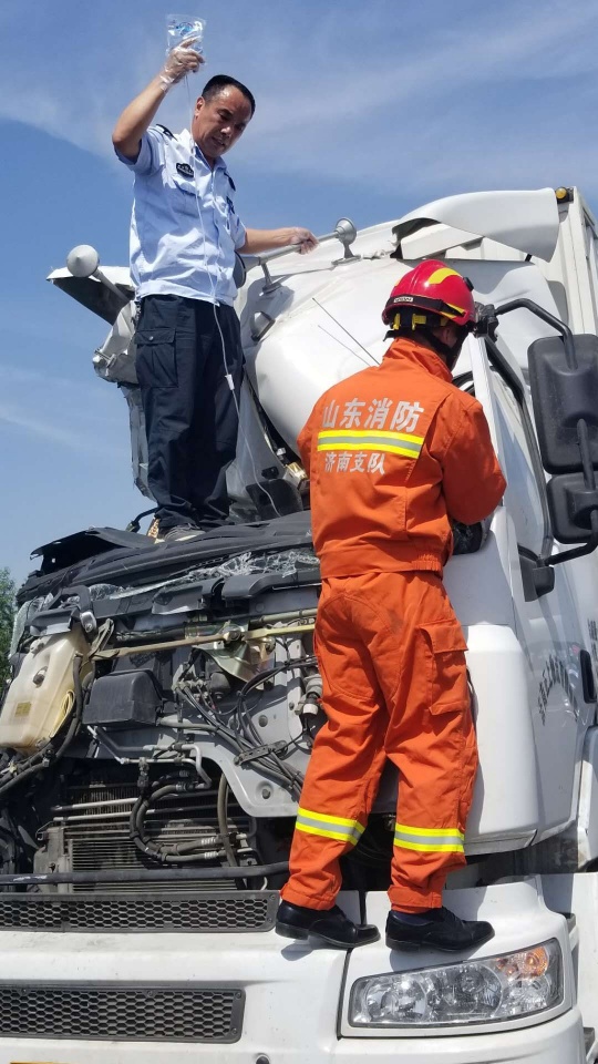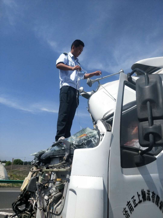 5月30日14时,室外阳光肆虐,热浪滚滚,济阳县医院急救中心的电话铃声响起:济阳至天桥服务区发生一起车祸。容不得丝毫犹豫,驾驶员王千、大夫周训成火速赶往现场。
