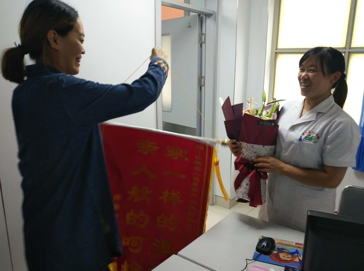 6月14日,孟女士要出院了,一家人怀着感恩之心,特地找到正在值门诊的李主任,将一面锦旗和一束鲜花献上。此时,正值门诊高峰期,熙熙攘攘的人群将诊室门口重重包围,共同见证了这感人又隆重的一幕。