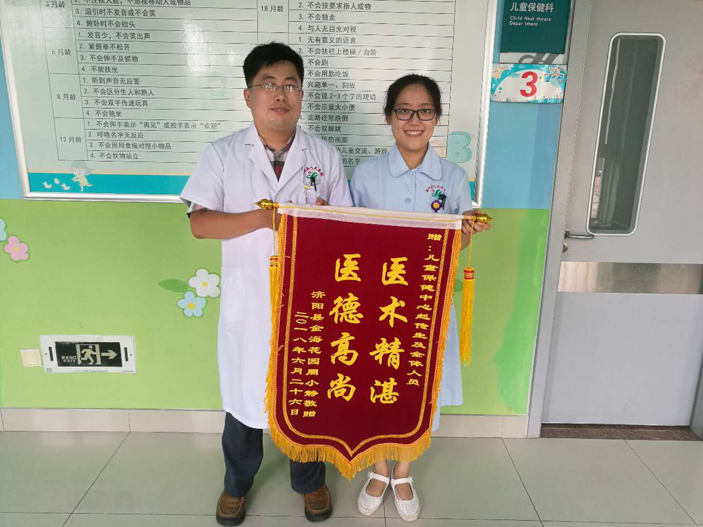 近日,金海花园的周女士将一面带有“医术精湛,医德高尚”的锦旗送到儿保中心赵传生大夫手中,以感谢这段时间以来对自己宝宝的精心治疗。
