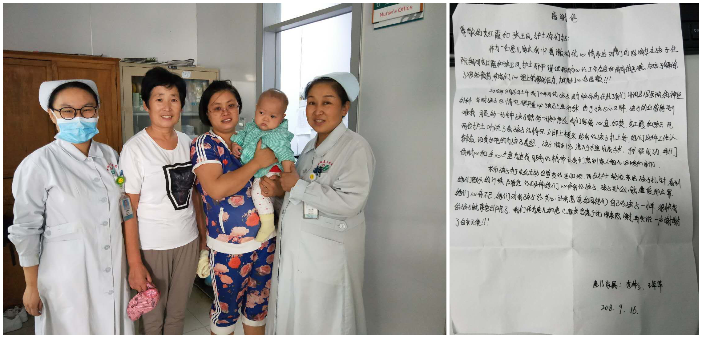 9月16号下午,小儿急症的医护人员正和往常一样紧张有序地进行着各自的工作,这时一位怀抱孩子的年轻母亲和一位老人进入了大家的视线,将一封感谢信,递到护士长手中,感谢长时间以来,小儿急症护理人员不辞辛苦的会诊,精准的穿刺技术保证了孩子术前术后及时的输液用药,减去了痛苦,尽快的康复。