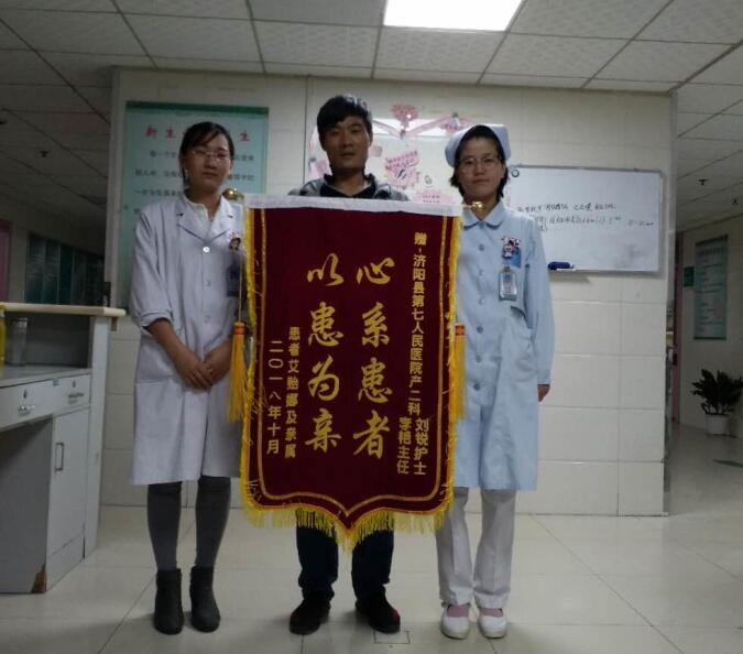 术后,责任护士刘锐耐心指导艾女士母乳喂养,精心交代术后恢复注意事项。期间,艾女士因术后身体较虚弱,自述左胸部疼痛、影响呼吸。产二科医护人员耐心给予心理疏导,详细查体,及时请相关科室会诊,排除相关并发症后给予对症治疗。出院后,艾女士心存感激,特意送来锦旗以表谢意。