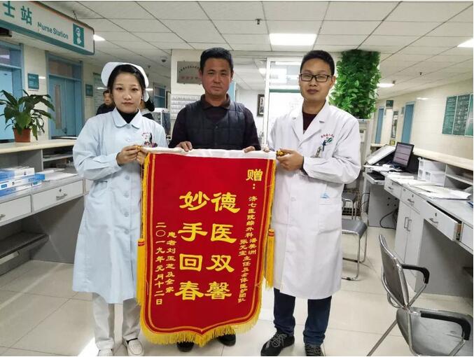2019年1月8日,张主任、潘主任、张文建医师成功为患者完成膀胱肿瘤切除手术。在医护团队及家属的精心护理照料下,患者术后恢复顺利,已经康复出院。患者家属在出院前送来“德艺双馨、妙手回春”的锦旗表达对医护团队的感激之情。
