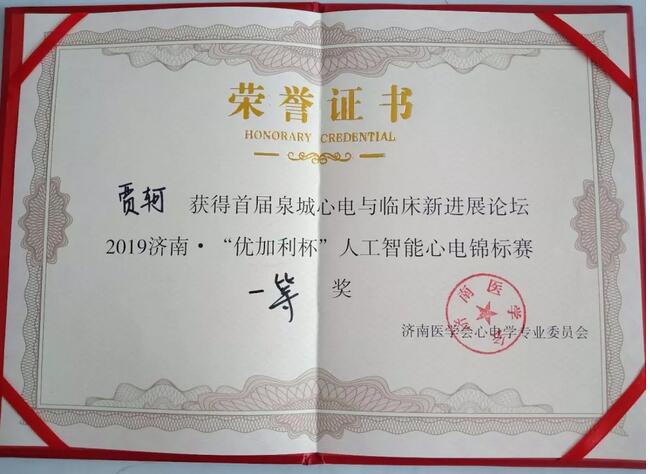 3月23日,济南医学会在济南颐正大厦举办了首届“济南·人工智能心电锦标赛”,我院心电图室的贾轲获得锦标赛阅图大赛一等奖,张振获优胜奖。