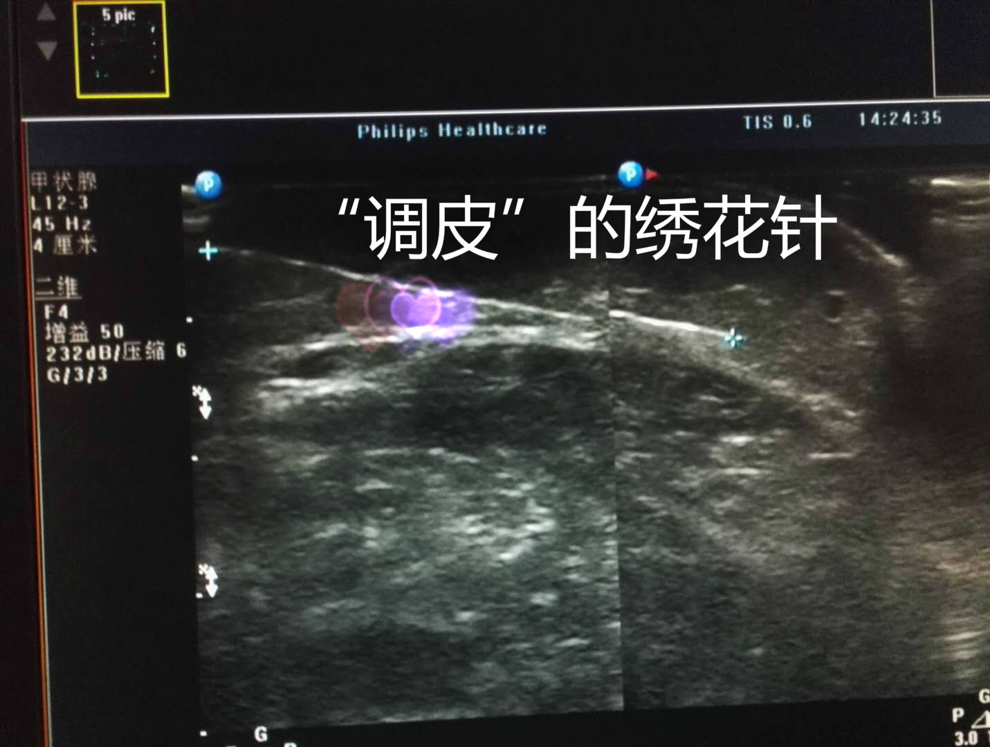 接诊医师初步怀疑其为软组织感染,随后由母亲抱入超声诊室检查,却发现其右小腿皮下软组织内见一强回声异物影。超声对所有的异物都显示为高回声,也有着高度的敏感性和特异性。这个检查结果,引起了接诊医师的高度怀疑,随问其母亲孩童近期有无玩耍金属制品,这位母亲回忆道:孩子曾在前天拿过一根绣花针,随后没有找到也并未在意。接诊大夫结合临床病史诊断为右小腿皮下异物,(金属针可能性大),随后收其入院,给予拍片检查,证实了医生的诊断。此时,孩子的母亲才后怕不已,一时的疏忽险些酿成大错,多亏及时就诊,医生正确的诊断,否则后果不敢设想。次日,医生便通过手术成功于患儿腿部取出一枚绣花针,目前,患儿处于康复阶段。