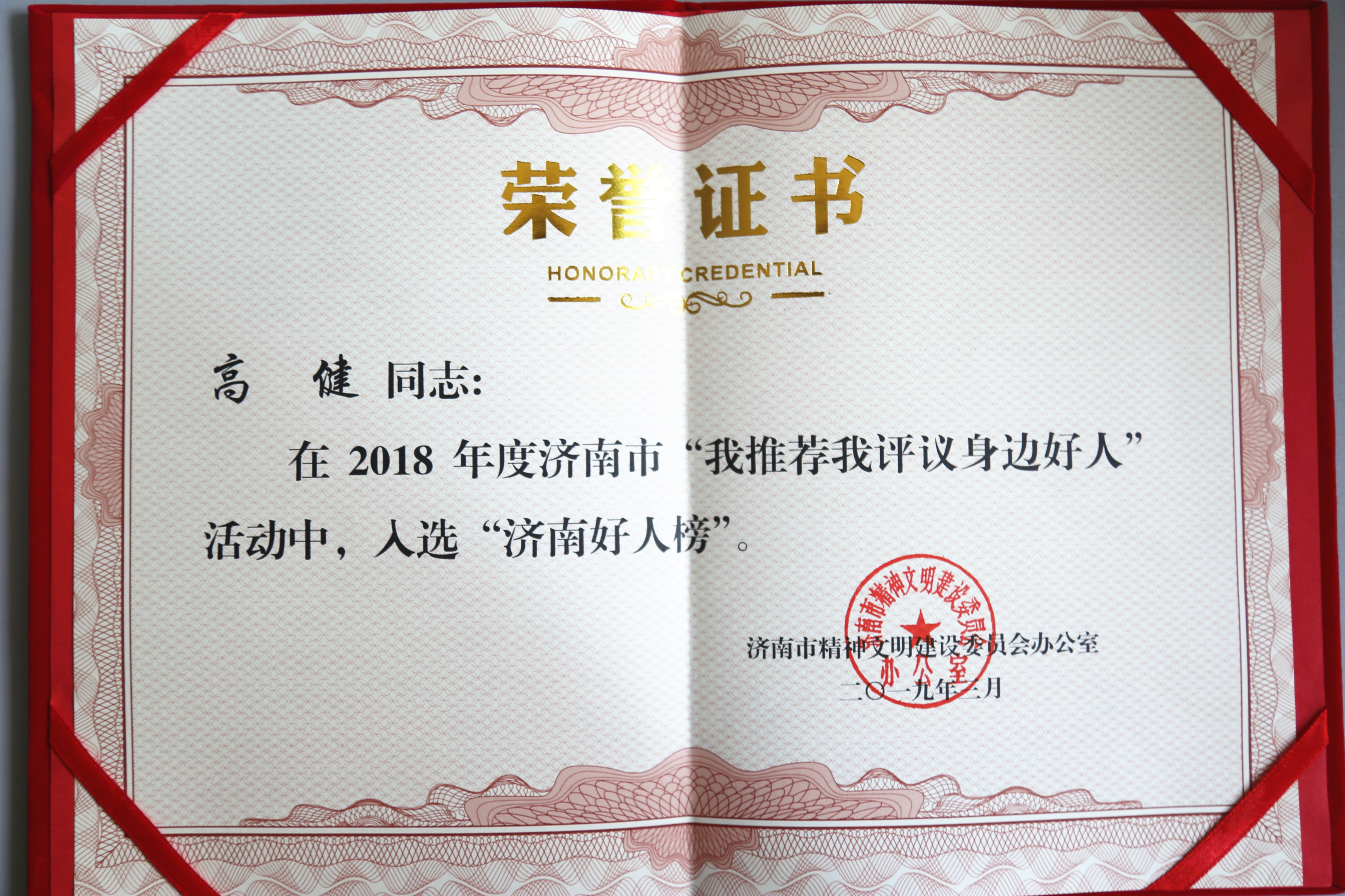 高健,济阳区人民医院手术室护士。他重责任敢担当,曾在开车回家途中,发现一辆满载润滑油、棉质工装等易燃易爆物品的货车冒起浓烟,一旦起火将发生爆炸,他义无反顾驱车赶上,舍身救火,手被高温灼伤满是血泡,衣服烧出一个个窟窿。事后,货车司机与润滑油老板送来“大火无情人有情,助人为乐显真情”的锦旗。因其事迹突出被区文明办推荐至“济南好人榜”。