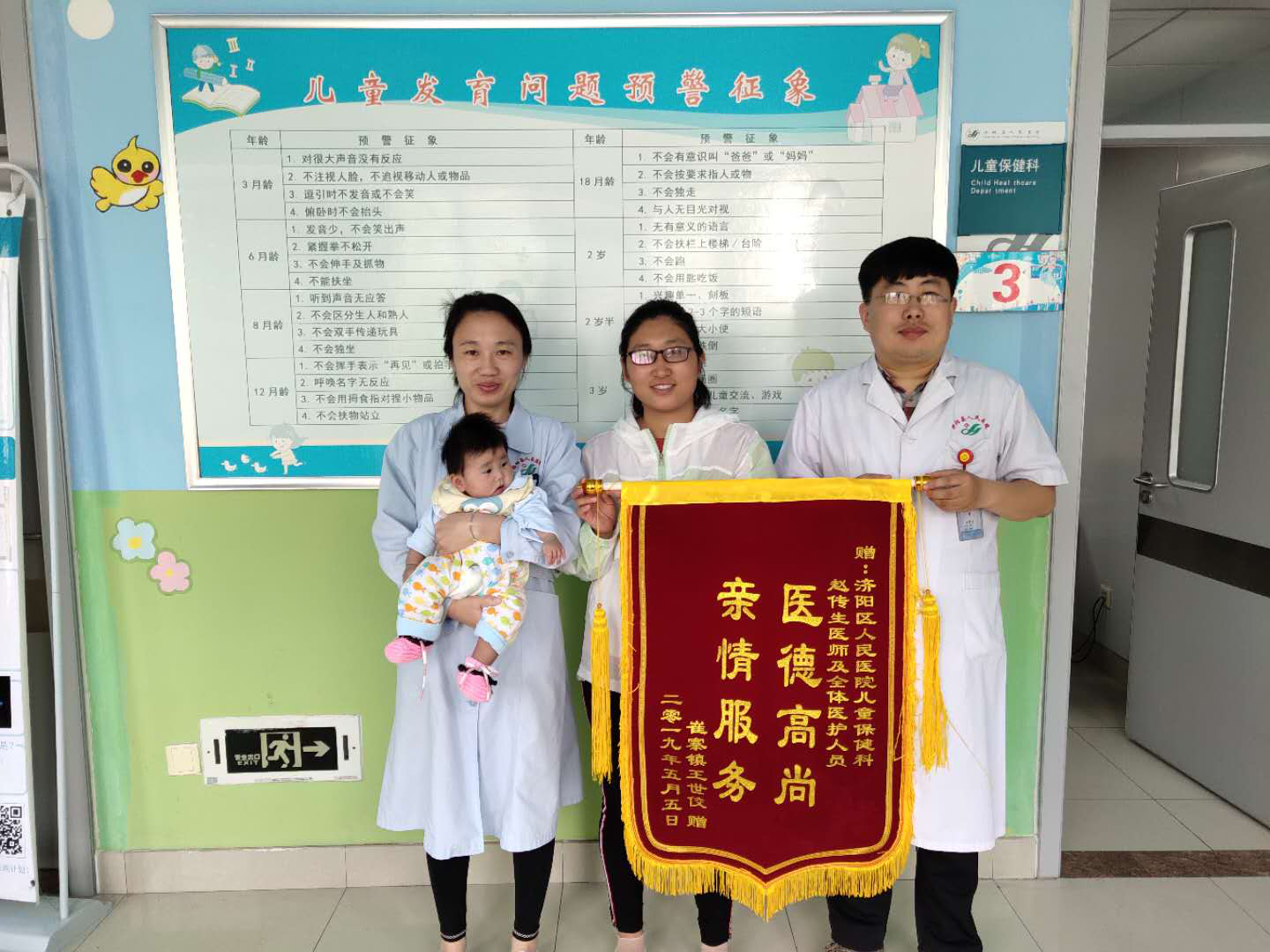 5月6日,患儿璇璇的母亲将一面“医德高尚,亲情服务”的锦旗交到儿保中心赵传生大夫的手中,以表达对赵大夫长期以来对宝宝精心治疗、认真服务的感谢之情。