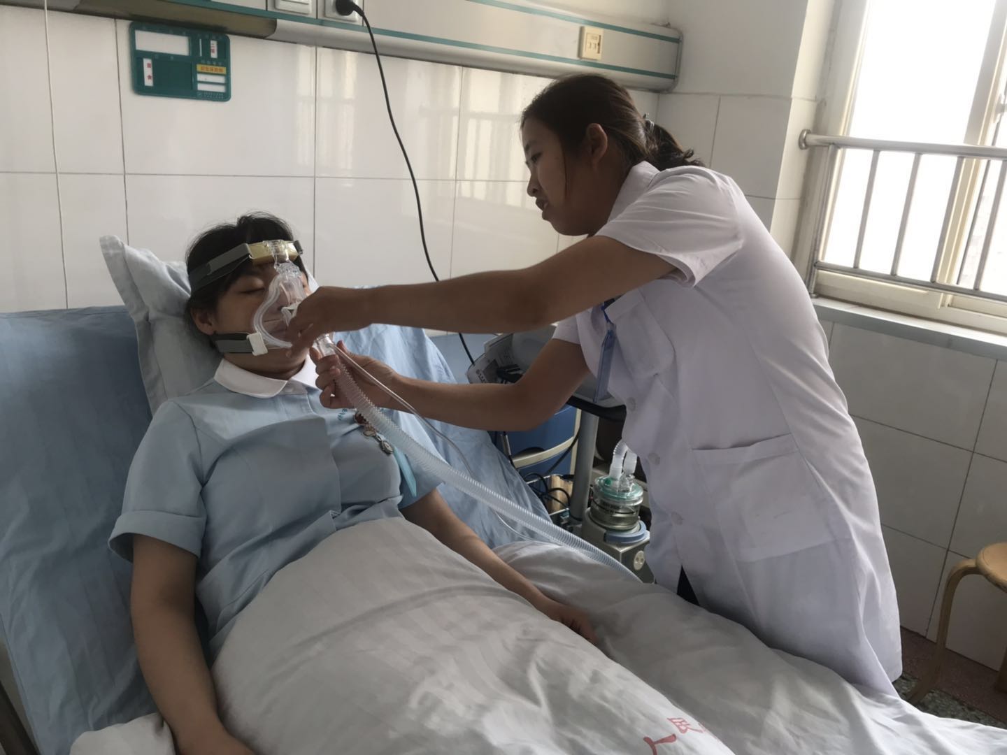 据参与体验的护理人员表述,刚带上无创呼吸机的瞬间,一股强大气流冲击口鼻。吸气时,呼吸机已停止送气,胸闷气短的感觉使人恐惧,伴随着呼吸机持续不断的报警声及面罩带来的面部压迫感,导致内心恐惧感剧增,呼吸节律越发紊乱,真正体验到了工作中所见的“人机对抗”!随后,在护士长张莹沉稳而清亮的宣教中,在黎娜娜医生专业的指导下,焦虑的情绪得以缓解,尝试以自主呼吸触发呼吸机送气,几分钟后,胸闷气短的症状逐渐消失。经过20多分钟与呼吸机的良好配合,身体逐渐放松,停止自主呼吸,完全依赖呼吸机进行肺通气。