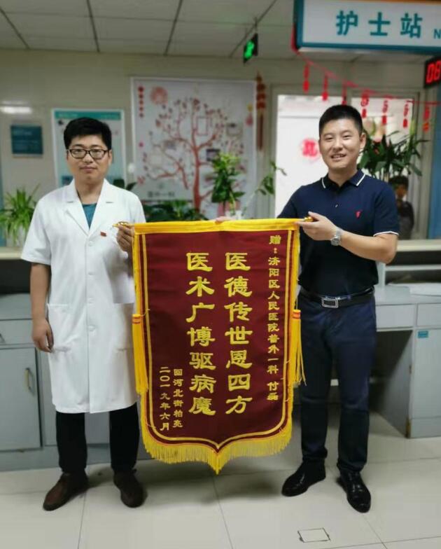 7月15日,一面绣有“医德传世恩四方 医术广博驱病魔”的锦旗被辗转送到了普外一科付磊医师的手中,付磊医师收到锦旗后十分诧异,再三回想后才想起手拿锦旗的患者及锦旗背后的故事。