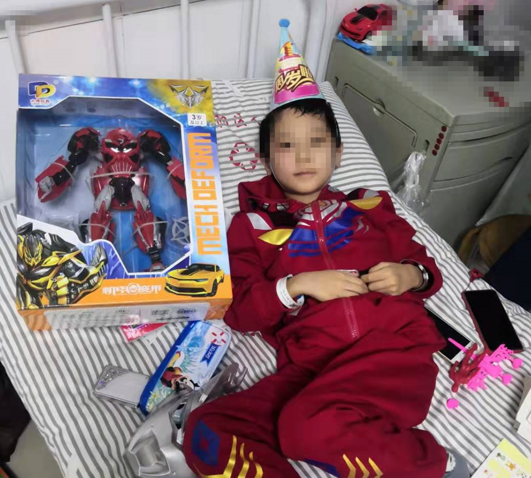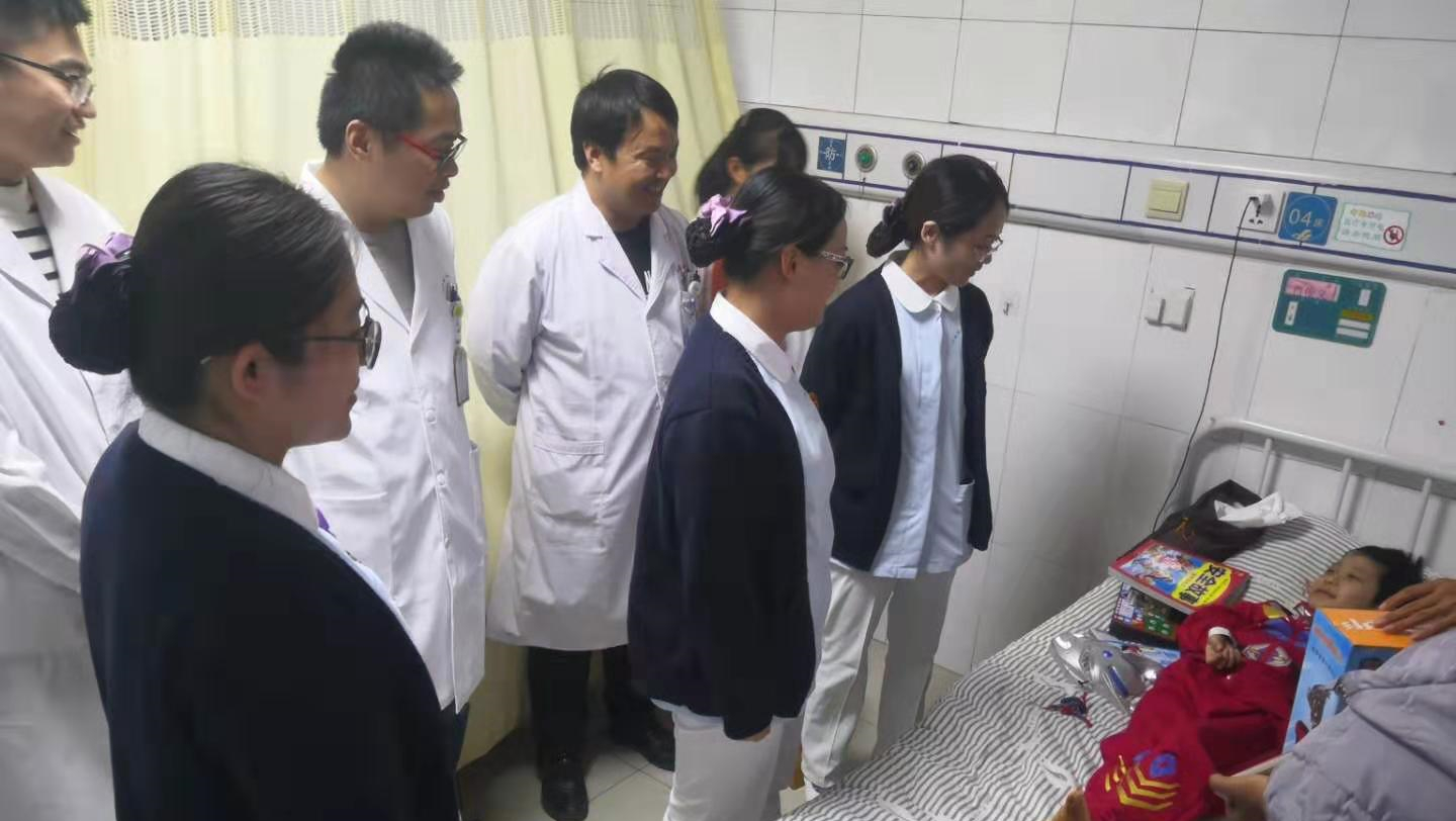 9月20日,小患者肖某某因交通事故伤及头部、腹部,伤后头部流血、上腹部持续性钝痛,伴恶心呕吐、四肢湿冷,急来我院就诊,经CT示脾破裂,肾挫裂伤,门诊以“头部腹部外伤1小时”收住入普外一科。入院时,患儿腹部积液较多,病情危重,其主治医师宋希福综合分析小患者病情,考虑其年龄较小,遂及时向其家属交待病情后,采取保守治疗。住院治疗期间,医护人员悉心照料,与小患者一家结下了深厚感情。机缘巧合,10月16日时逢小患者7岁生日,患者家属与医护人员齐心安排,为小患者准备了一场别样的生日会,漂亮的大蛋糕和护士长卢静静阿姨精心准备的生日礼物,伴随着欢快动听的生日歌与最美的祝福,病房一派欢乐温情。目前,小患者已停药,病情恢复良好。