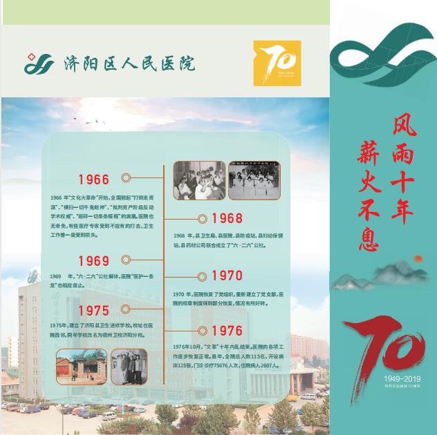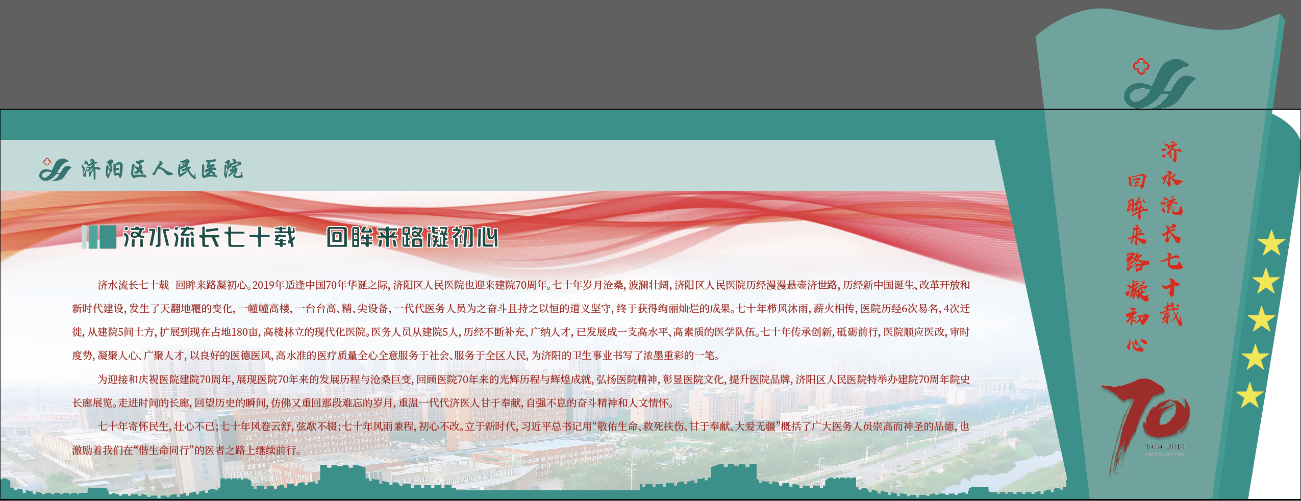 首先是以“济水流长七十载,回眸来路凝初心”为题的前言部分,综述了医院七十年的发展变化,回顾了医院七十年的发展轨迹,表明了建设院史长廊的初心与使命。