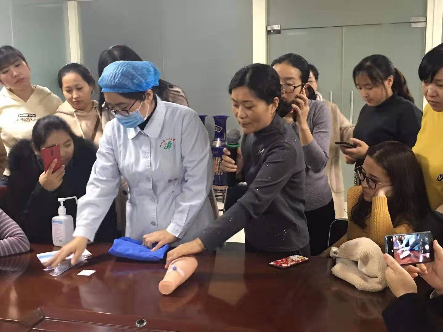 王静护士长针对近期置管维护中出现的常见问题一一举例进行说明,从接头的消毒与更换,皮肤的消毒手法及面积,导管的固定及更换敷贴等方面逐一讲解,手把手指导操作。培训过程中,大家积极提问,相互交流,共同探讨PICC置管维护中遇到的疑难问题,王静护士长耐心为大家解答,参加培训的护理人员表示受益匪浅。