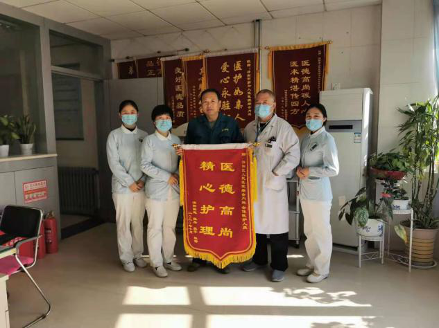 近日,曾在我院综合内科就诊的张志国大爷的家属手捧一面写有“医德高尚,精心护理”字样的锦旗送到了济阳区人民医院东院区综合内科护士站,以表示全体医护人员的感谢!