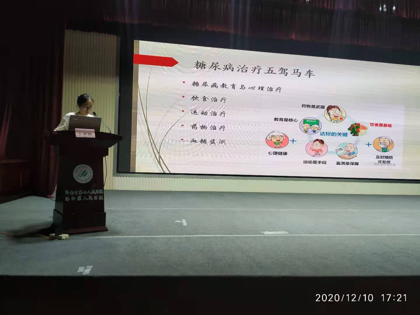 此次业务讲座由老干部科主管护师王珊珊及CCU主管护师寇清霞主讲。王珊珊深入浅出的从饮食、运动、用药指导、血糖监测、生活护理等方面给大家讲解了有关糖尿病病人健康指导的相关知识,从而指导各临床科室更好的服务于患者,有效的预防糖尿病的发生。