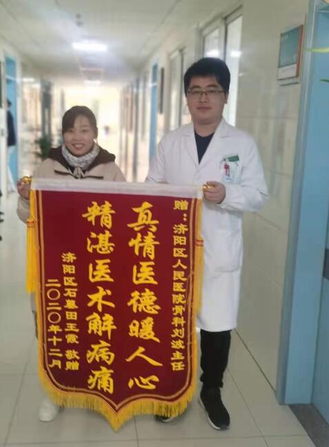 意外之喜。两年后,2020年冬,收获健康与幸福的王女士不忘当年刘主任的精心治疗和科室人员的用心护理,特将一面写有“精湛医术解病痛,真情医德暖人心”的锦旗送到骨一科,对刘主任与科室人员表示衷心感谢。