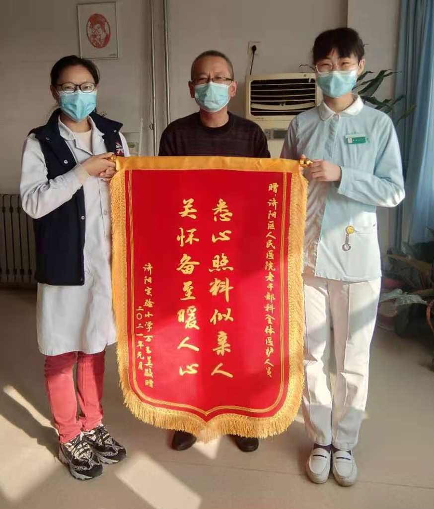 1月26日,老干部科患者万大娘的儿子将一面印有“悉心照料似亲人,关怀备至暖人心”的锦旗送到护士站,再三感谢全体医护人员对其母亲的精心照顾。