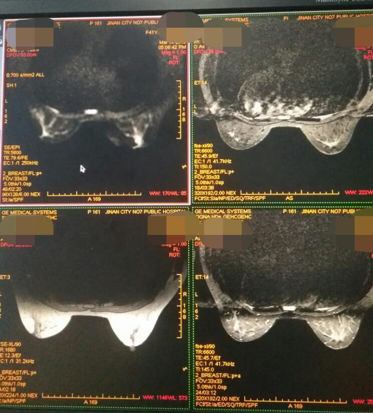 磁共振检查技术作为近年迅速发展应用的一门医学影像技术,是继乳腺B超和钼靶之外的另一项检查,可多方位、多序列显示乳腺疾病,尤其是特有的DWI(扩散加权成像)和动态增强扫描对检出细小病变及鉴别病变性质方面有明显优势。
