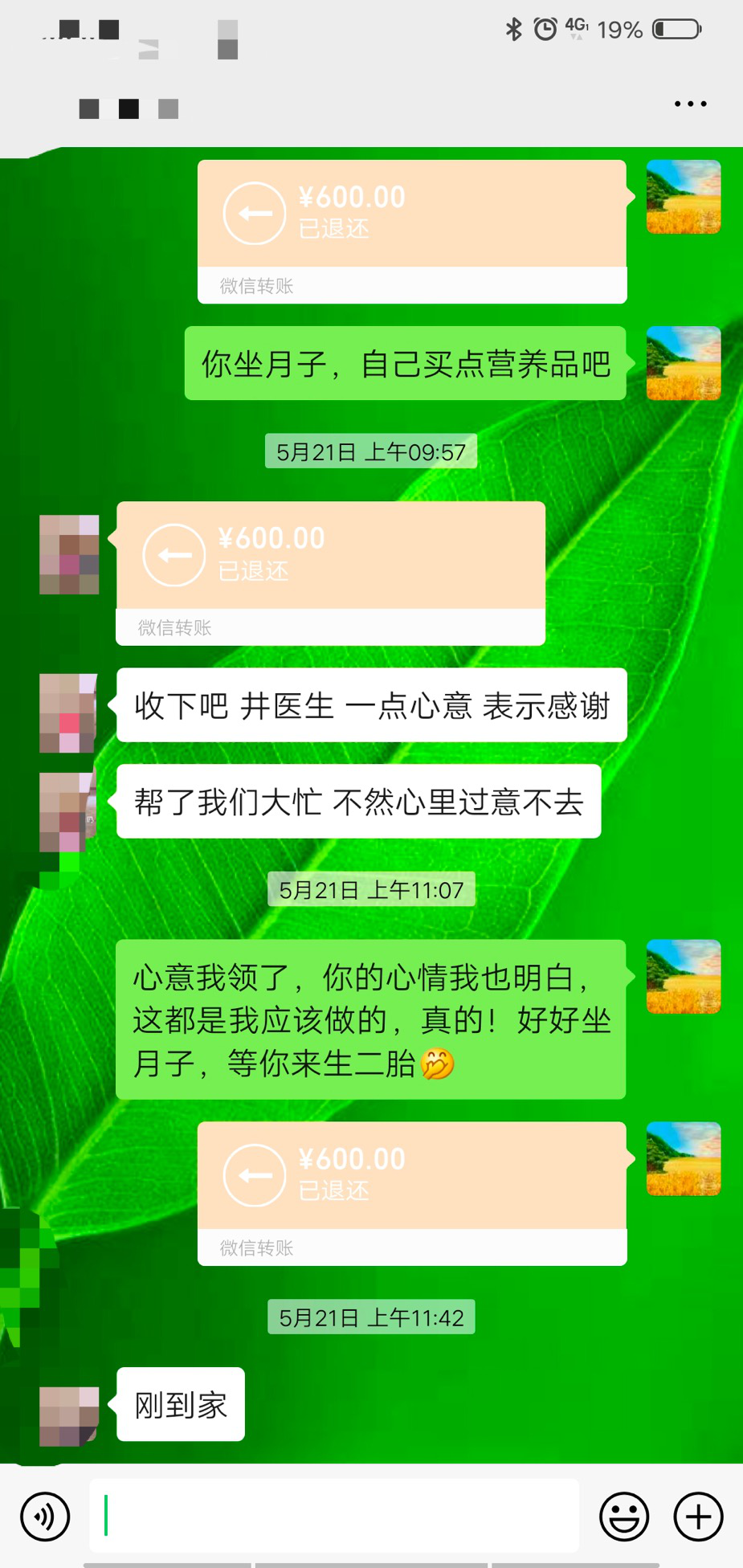 无独有偶,5月21日早上,井医生查房后,发现微信显示,刚刚出院的19床产妇向其发来600元红包,井医生立即退还红包,并回复“谢谢你的信任,愿意继续为你服务,坐月子自己买些营养品吧!”原来,19床产妇自然分娩时存在紧急剖宫产的危险,且思想压力较大,井医生一直陪伴左右,给予精神和专业技术的帮助。产妇看在眼里记在心里,产后非常感激,连发两次红包表达感激,井医生都已委婉拒绝。