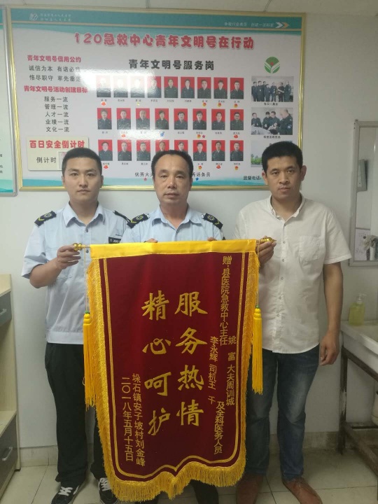 5月16日,垛石安子坡村的一名产妇家属刘先生将一面印有“精心呵护,服务热情”的锦旗送到了急救中心办公室以表达自己的感激之情。
