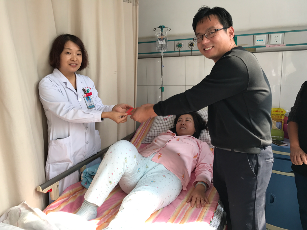 近日,产一科李红主任和李琳护士长共同来到产妇李女士床旁,将一个大红包送回到其丈夫手中。