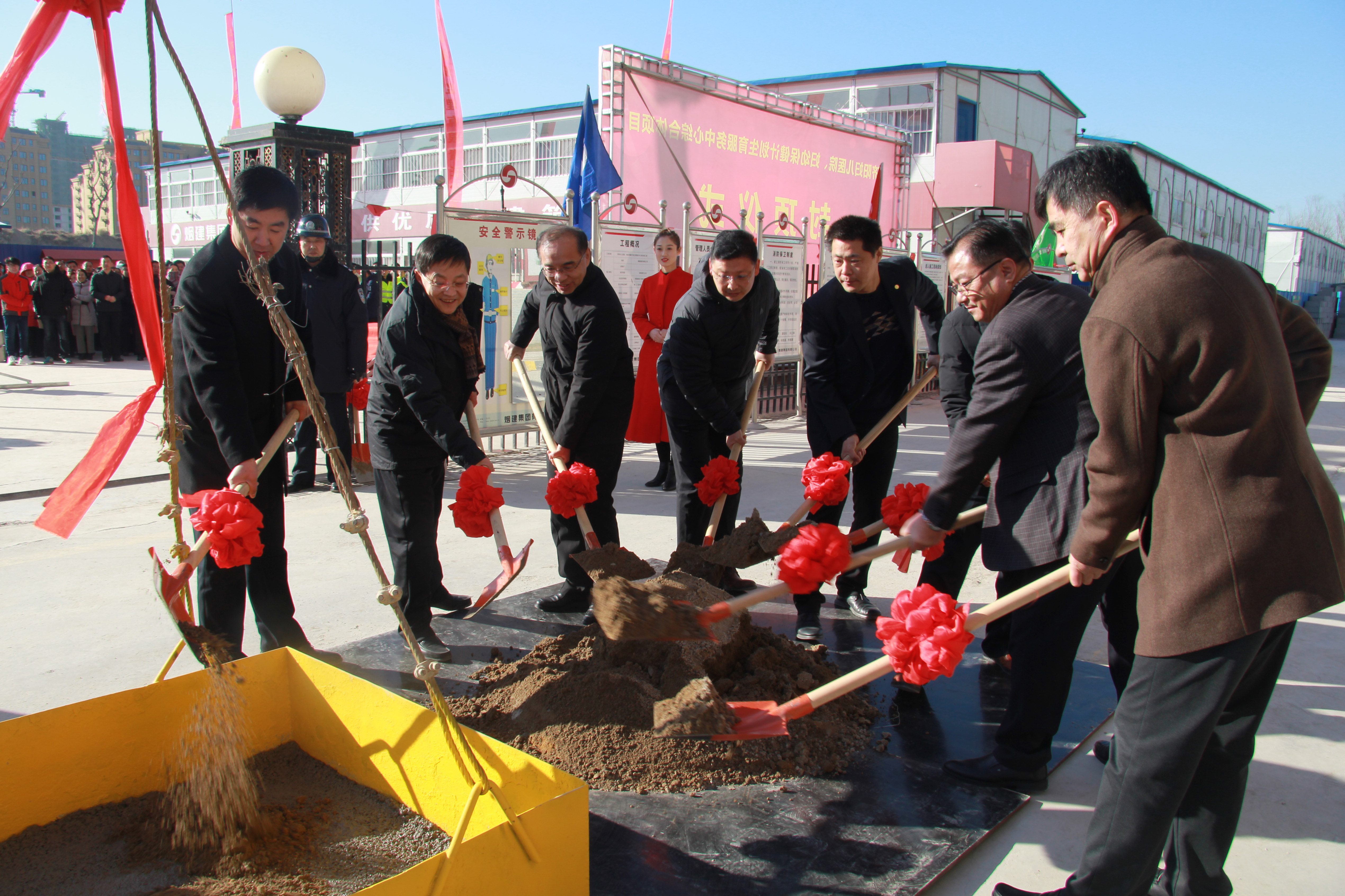 最后, 领导、嘉宾共同挥锹将混凝土送至空斗中,该斗混凝土被运送至妇儿楼楼顶,为妇儿医院大楼浇筑最后一斗混凝土,轰鸣的礼炮声中,妇儿医院楼顺利完成主体结构封顶仪式!
