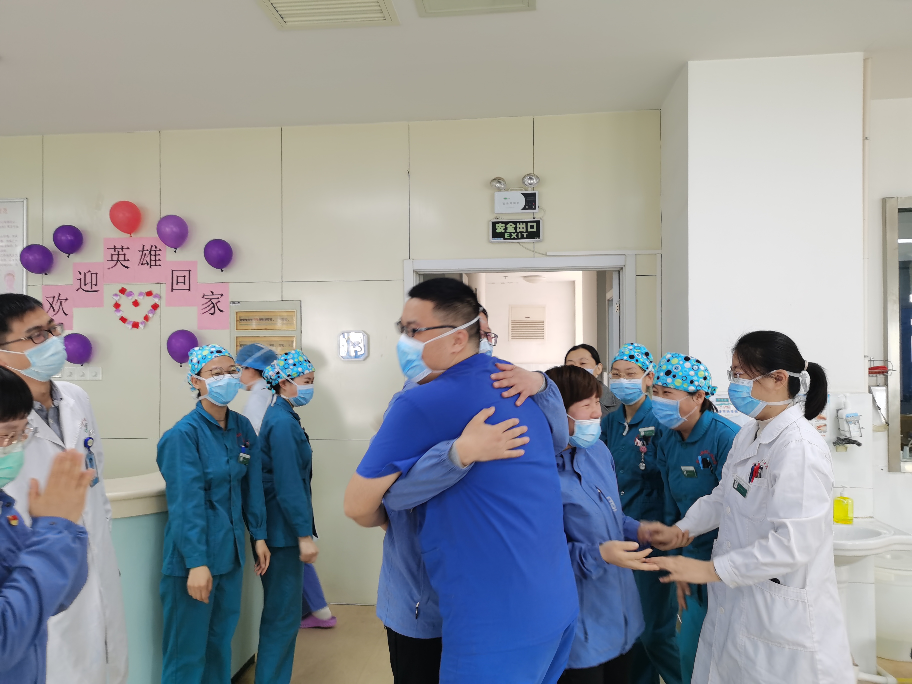 4月13日清晨,在阵阵掌声和同事们的欢迎声中,我院三名援鄂勇士张红停、李风云、孙立群走进阔别两月有余的医院。为欢迎他们的正式归队,医院在二楼会议室简单而又隆重地举行了“欢迎援鄂勇士归来座谈会”。