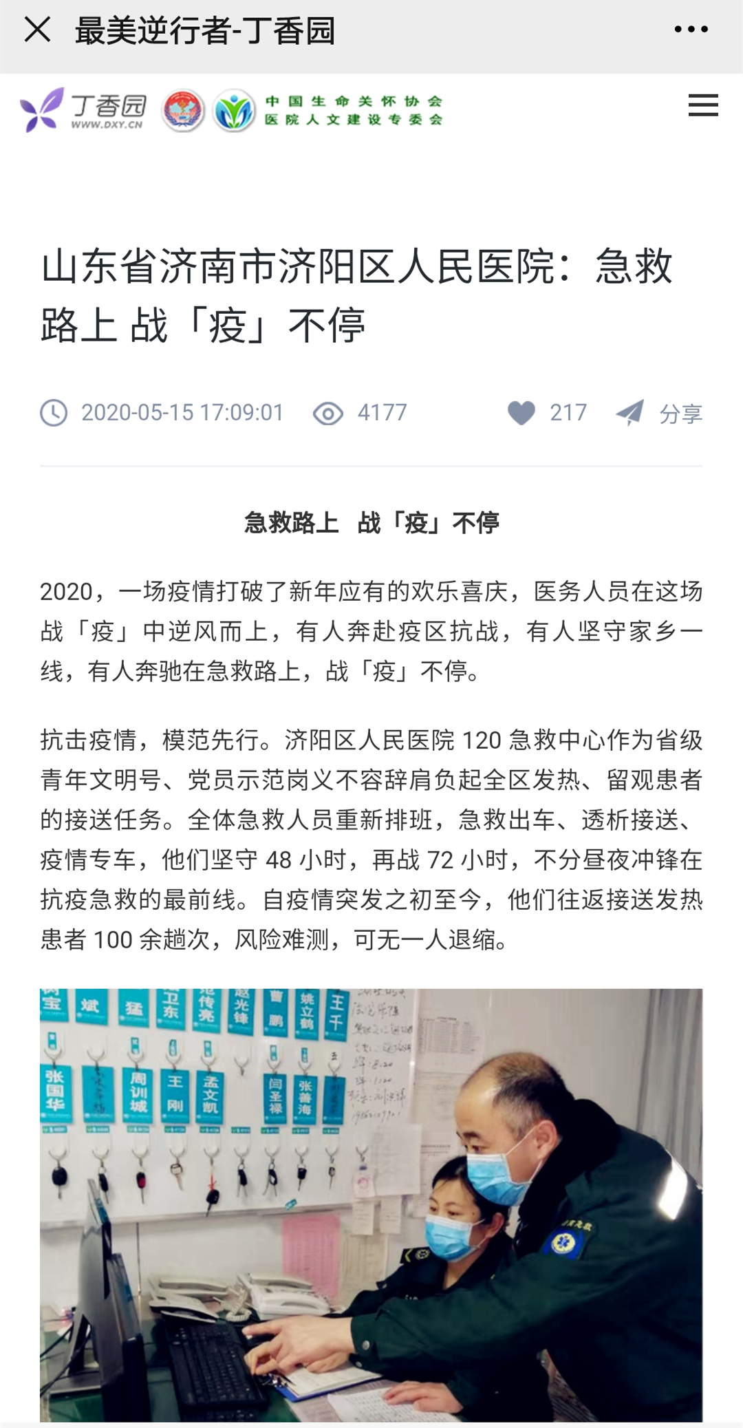 近日,由丁香园联合中国生命关怀协会医院人文建设专委会发起的“最美逆行者”优秀案例征集评选活动最终评选结果正式揭晓! 我院“急救路上,战疫不停”获“最佳新闻作品”奖;“战疫来临,有召必应”获“最佳纪实摄影”奖。