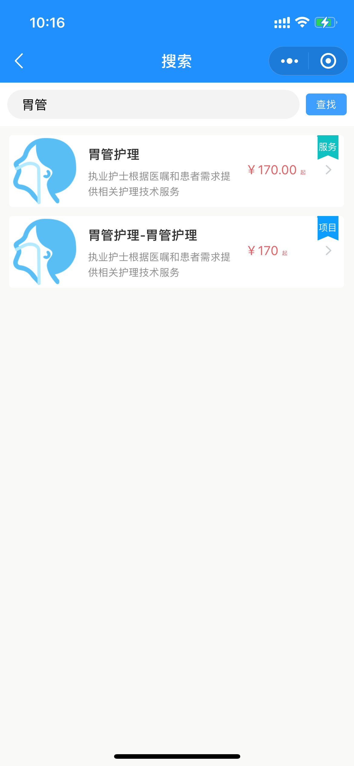 1.患者通过首页-搜索栏查找所需的服务项目,如:胃管护理、尿管护理等,或在专科护理分类中查找相应的服务项目