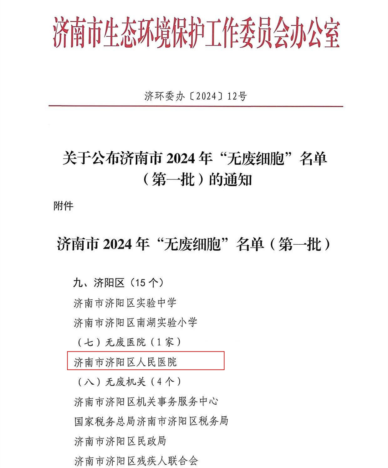 近日,济南市2024年第一批“无废细胞”名单公布,济南市济阳区人民医院荣获济南市首批“无废医院”荣誉称号。这一荣誉不单是对医院长期致力于绿色健康发展的肯定,更是医院在提供高质量医疗服务方面不懈努力的成果展现。