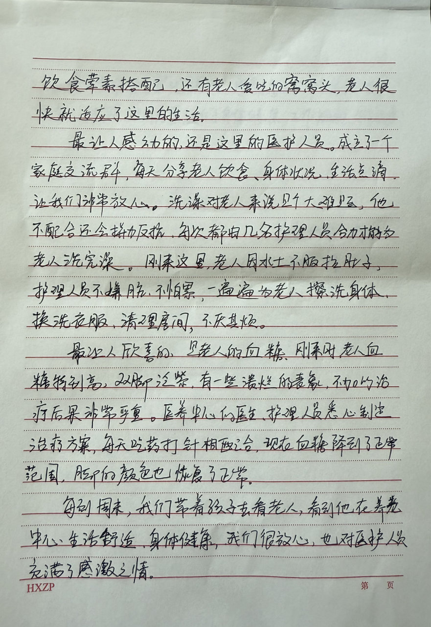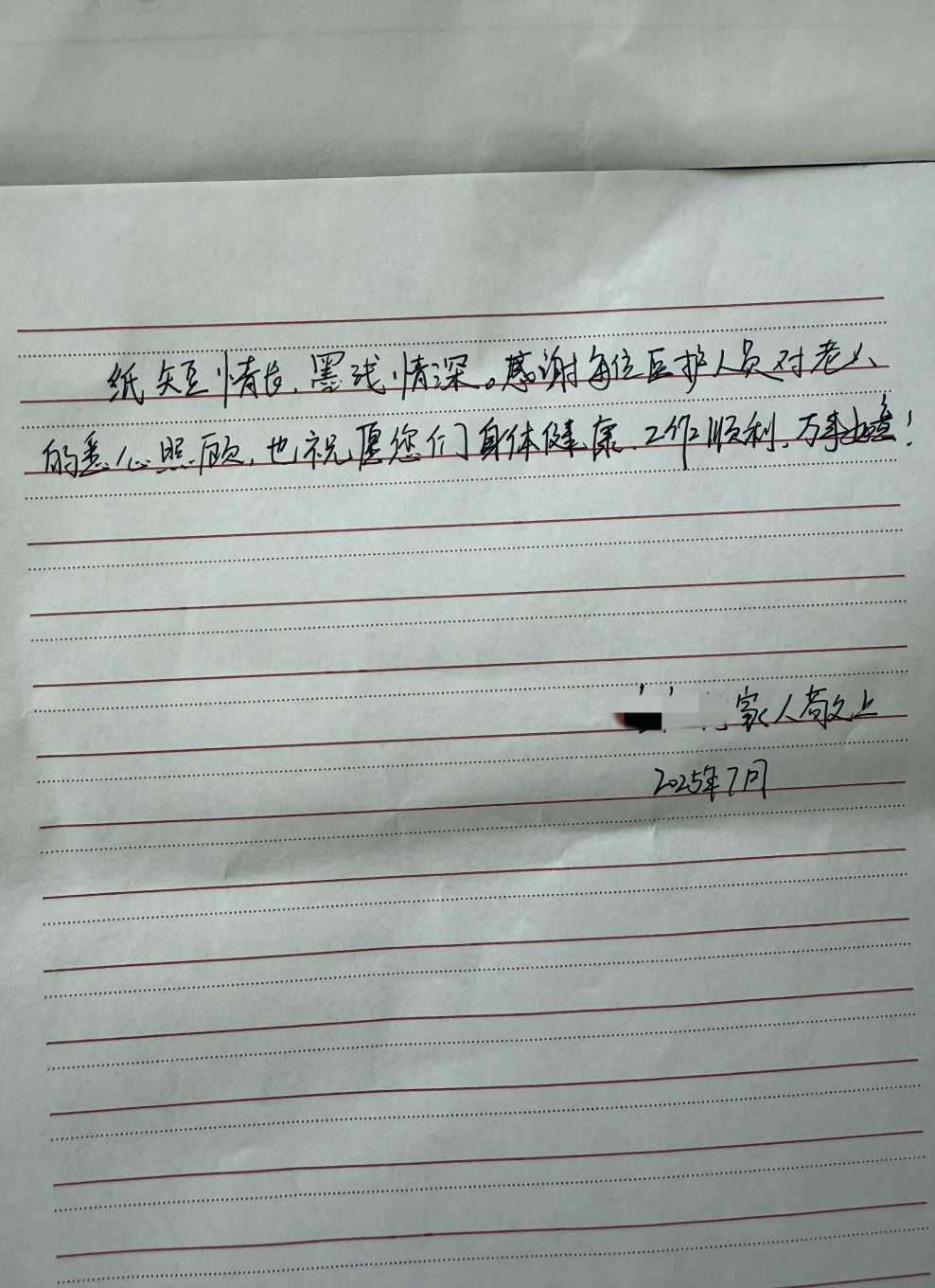 7月27日上午,济阳区人民医院医养服务中心收到了一面饱含深情的锦旗和一封手写感谢信,患者家属对中心医护人员及护理团队在照护阿尔茨海默病老人过程中的专业、耐心和爱心表达了诚挚谢意。