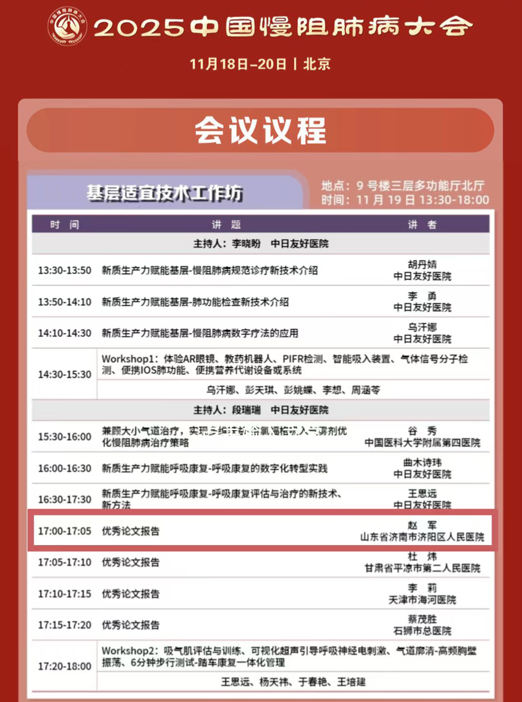 11月19日,中国慢阻肺病学术大会在北京举办,我院赵军医师撰写的《呼吸肌康复疗法对慢阻肺(COPD)患者的影响研究》被大会评为优秀论文,其本人受邀在基层适宜技术工作坊分会场作专题口头报告。