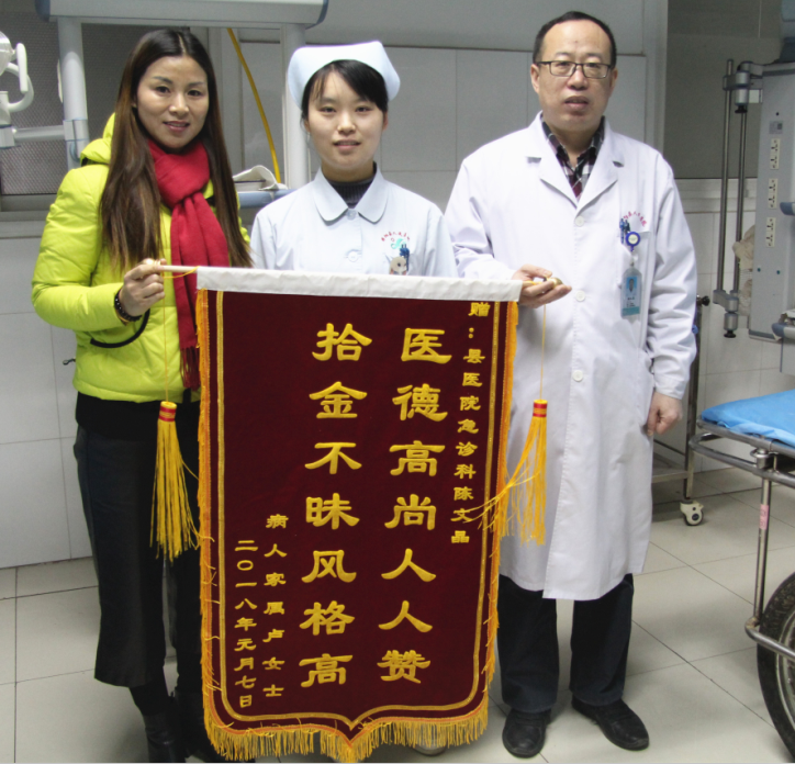 钱包失而复得,卢女士喜出望外,为了感谢陈护士,她特地制作了一面锦旗送到县医院急诊科。经过了解才知道,原来是当时陪母亲看病心切,不经意将钱包掉在了厕所旁,幸好被陈护士捡到。陈护士第一时间向张主任汇报了情况,通过核实身份证信息,迅速从就诊患者的个人信息里查找出卢女士的联系方式,并及时电话通知其速来医院领取。拿到钱包后,卢女士激动地说:“里面有4000多元现金,还有身份证、银行卡等各种证件,对我很重要,真心的感谢你们!”