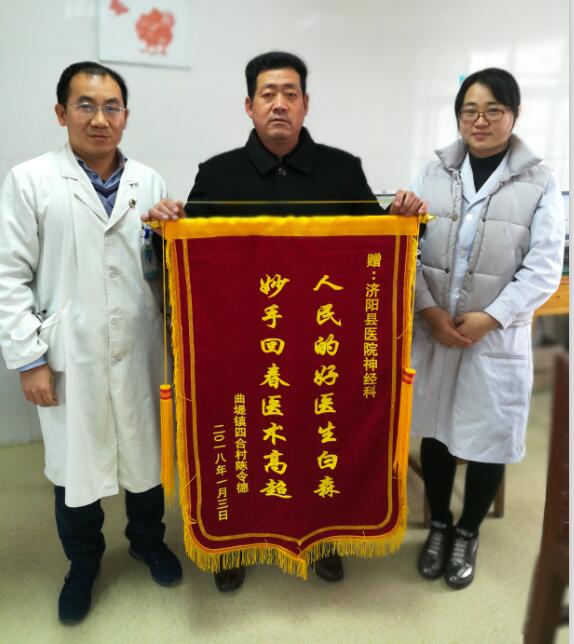 据了解,曲堤四合村的陈大爷长期备受失眠的困扰,辗转周边多家医院治疗后,效果欠佳,遂来医院就诊。白森医生接诊后,耐心了解患者病情,给予心理疏导,并结合病情立即对症开药。陈大爷用药后,长期的失眠症状得到了明显改善,一家人都特别激动,特地赠送一面锦旗,以表谢意。