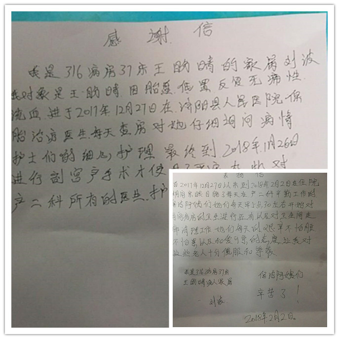 我院产二科产妇累计住院61天 感受亲人关怀深情书写感谢信