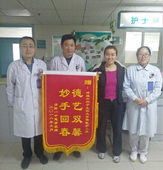 手术医师争分夺秒齐心救治,手术历时4小时,顺利完成。术后,王先生转至重症监护室进一步观察,一周后,患者病情趋于平稳,转回神经外科病房继续接受康复治疗。住院期间,医护人员不曾有一丝懈怠,对其无微不至、尽心尽力。患者一家被医护人员的用心和专心所感动,更是对患者的恢复情况十分满意,近日特地送上锦旗,再三致谢。