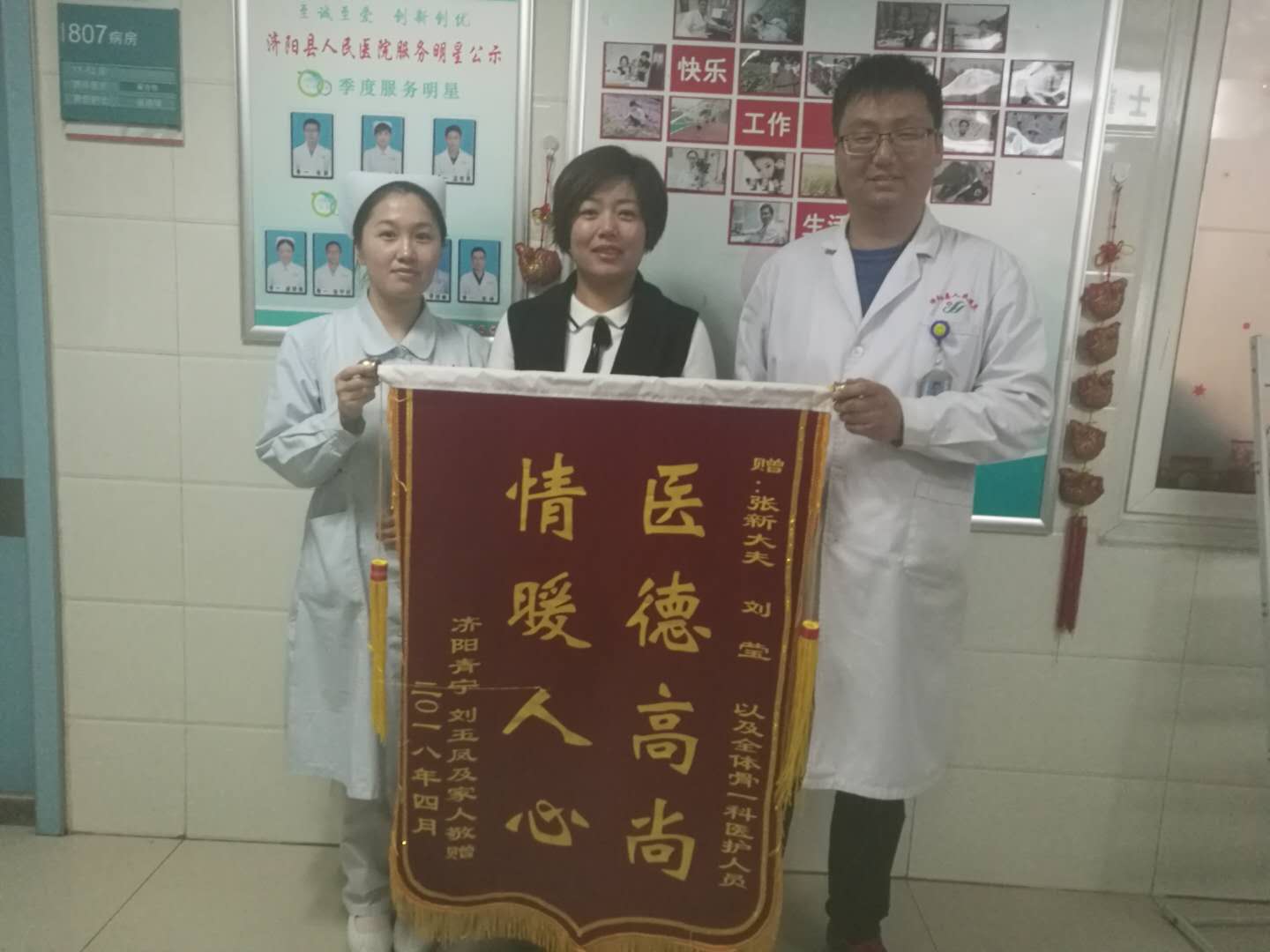 出院之际,刘某的女儿特地送来2面锦旗,表示感谢。说道:“还是自己家乡的医院有温暖、有温情啊,在自己家门口看病,有你们的照顾特别安心”。
