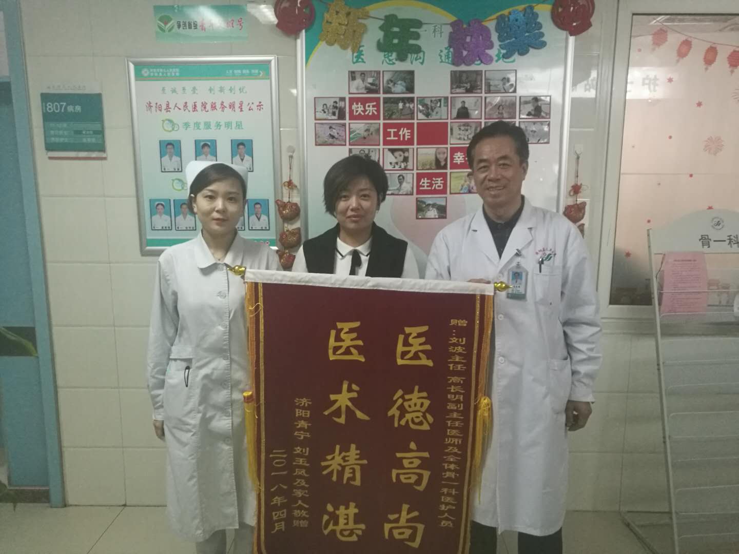 近日,骨一科患者刘先生的女儿送来两面锦旗,一面感谢高长明医生及全体骨科医护人员,另一面特地感谢张新医生及刘莹护士,感谢他们无微不至的医疗照护。