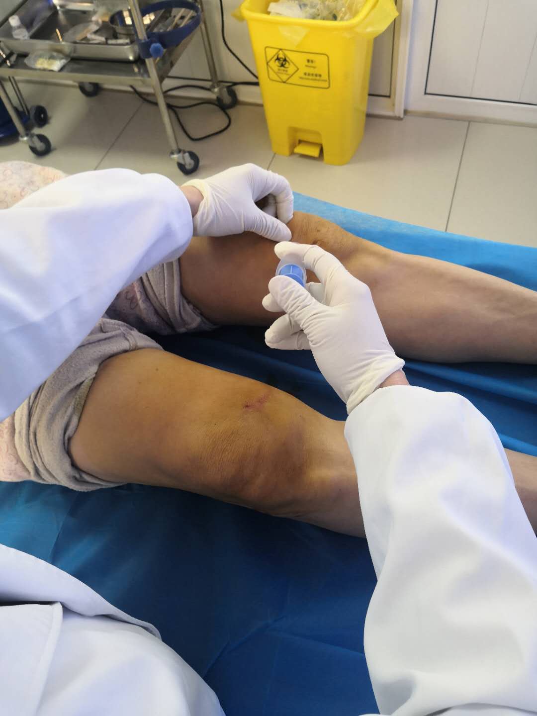患者,男71岁,双膝关节疼痛病史10年余, 最近无明显诱因出现双膝关节痛, 最多行走50米,患者疼痛难忍,生活质量差,遂来区人民医院疼痛科就诊。经门诊详细检查确诊为:膝关节骨性关节炎、膝关节腔积液。完善检查后疼痛科医师为其进行了超声引导下膝关节腔注射+隐神经射频消融术等治疗。术后患者感觉疼痛较前减轻明显,完成一个疗程(7天)的治疗后,患者膝关节功能恢复良好,膝关节周围无明显痛点,膝关节内翻明显改善,行走距离明显增加。