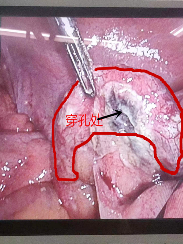 24日00:00 患者在李心柱主治医师陪同下进入手术室,全麻下行腹腔探查,术中见肝周、髂窝、盆腔大量白色脓性液体(约400ml),阑尾中段坏疽穿孔(如图),给予行腹腔镜下阑尾切除+腹腔冲洗引流术,手术过程顺利,患者恢复良好,已康复出院。