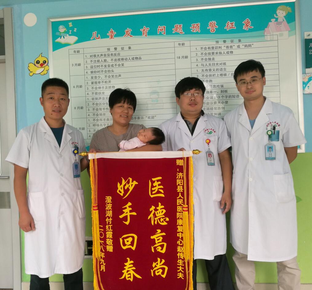 9月3日,家住澄波湖小区的付红霞女士将一面写有“医德高尚,妙手回春”的锦旗送到了儿保中心赵传生大夫手中,以表达对赵大夫长期以来精心治疗的感激之情。