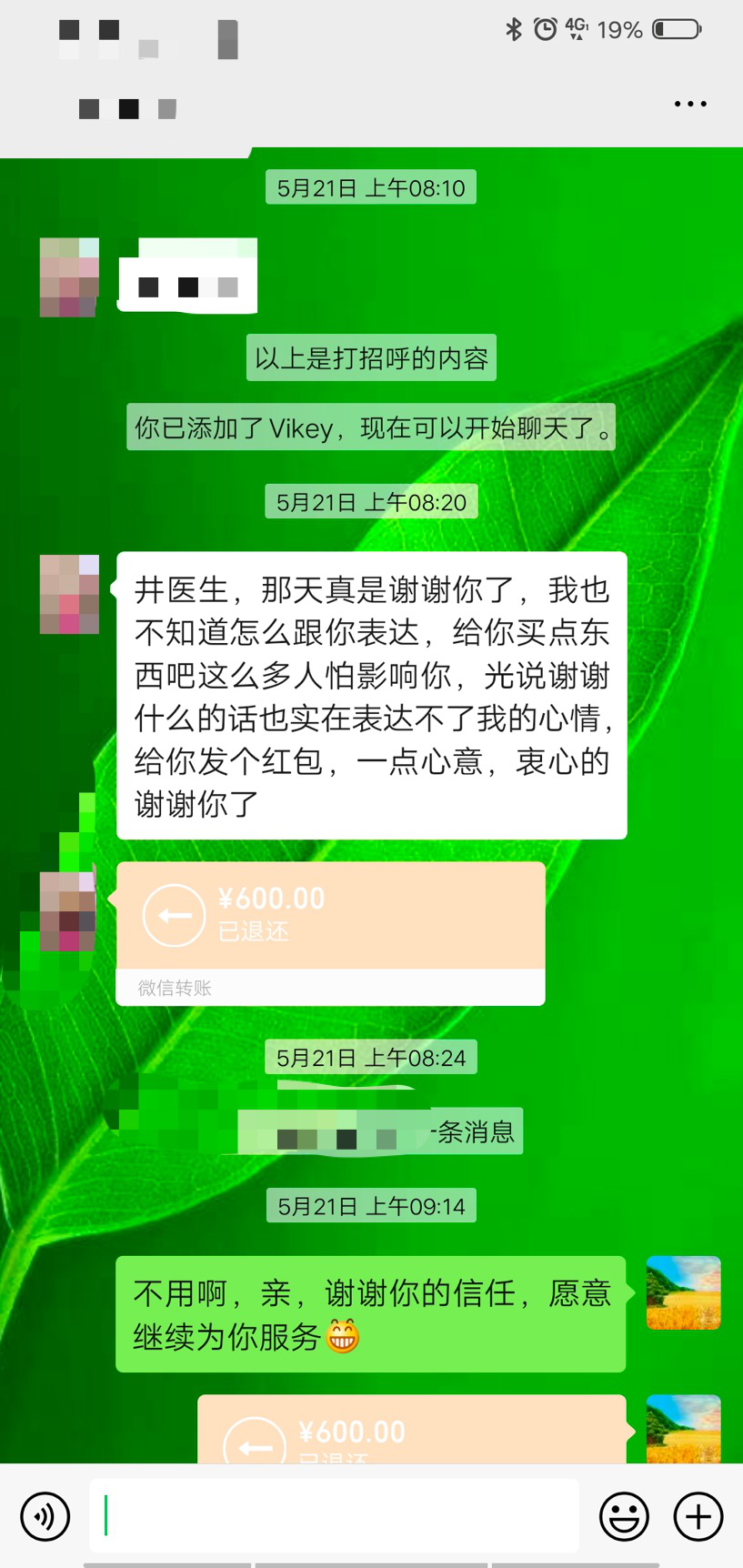 无独有偶,5月21日早上,井医生查房后,发现微信显示,刚刚出院的19床产妇向其发来600元红包,井医生立即退还红包,并回复“谢谢你的信任,愿意继续为你服务,坐月子自己买些营养品吧!”原来,19床产妇自然分娩时存在紧急剖宫产的危险,且思想压力较大,井医生一直陪伴左右,给予精神和专业技术的帮助。产妇看在眼里记在心里,产后非常感激,连发两次红包表达感激,井医生都已委婉拒绝。