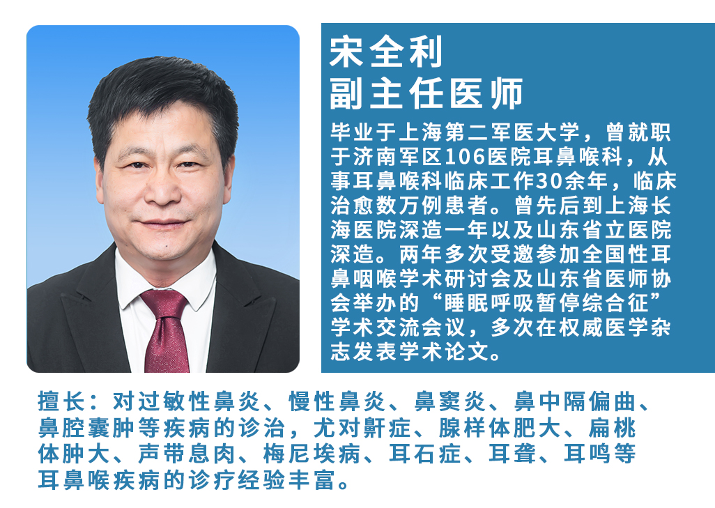 国庆期间,名医面对面,专家不停诊:山东知名耳鼻喉科专家宋全利教授10月1日-7日坐诊,有需要的患者可提前预约。