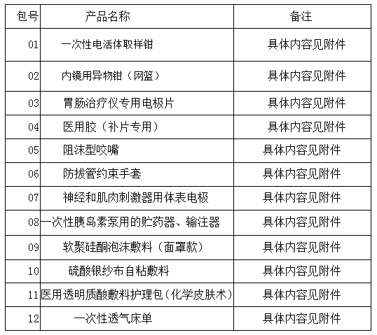 二、采购项目:一次性电活体取样钳、内镜用异物钳(网篮)、胃肠治疗仪专用电极片、医用胶(补片专用)、阻沫型咬嘴、防拔管约束手套、神经和肌肉刺激器用体表电极、一次性胰岛素泵用的贮药器、输注器,软聚硅酮泡沫敷料(面罩款)、硫酸银纱布自粘敷料、医用透明质酸敷料护理包(化学皮肤术)、一次性透气床单。