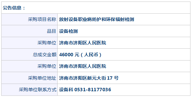 济南市济阳区人民医院放射设备职业病防护和环保辐射检测项目成交公告