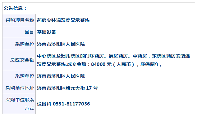 济南市济阳区人民医院药房安装温湿度显示系统项目成交公告