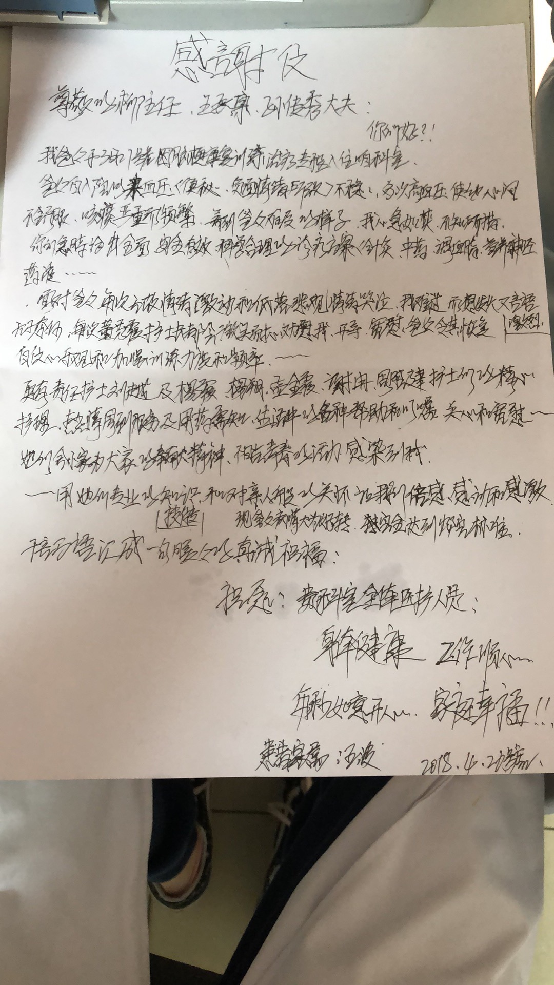 患者王先生,1月前因“脑梗死”入住中医科病房,患者过往有高血压史,情绪波动较大,时而嬉笑不止,时而悲忧哭泣,导致患者血压不稳,多次出现胸闷不适,且咳嗽咳痰严重,康复意识较差。家属心急如焚,束手无策。中医科柳宪翠主任及骨干团队根据其病情制定出科学有效的治疗方案,中药、针灸,调节血脂,营养神经,很快患者咳嗽、咳痰及便秘情况明显好转。根据患者的心理状况,医护人员对患者及家属进行心理疏导,护士长董秀霞每每耐心地劝慰,细心地讲解病情、生活等方方面面,护理团队专业的护理、热情周到的服务、生活上力所能及的帮助,舍小家为大家的奉献精神,充满阳光的青春活力感动了患者家属,让他们重拾康复的信心,患者病情也逐渐好转,现已康复出院。患者家属不善言辞,但感激之情无以言表,便在出院之际,送上一封亲笔书写的感谢信及锦旗。