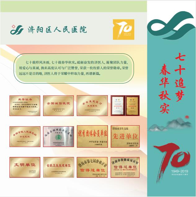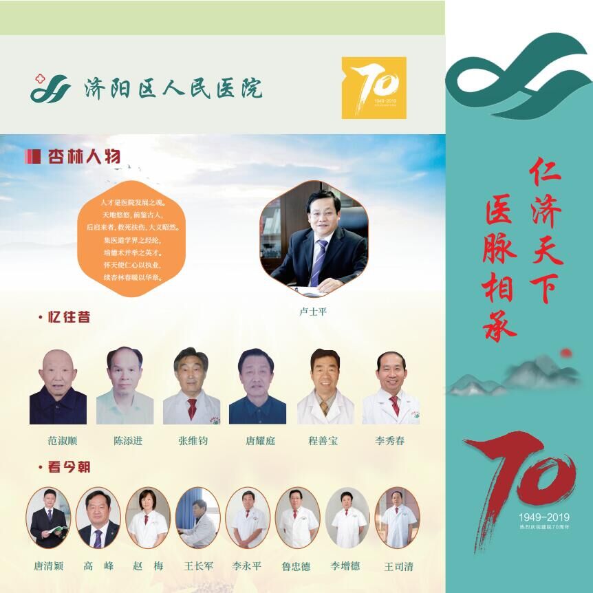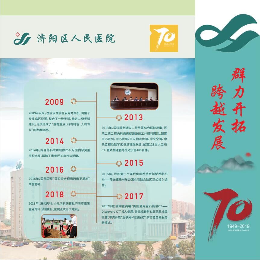 走进院史长廊,触摸医院历史。七十年发展历程,浓缩在长廊每一帧图文中。长廊终点,展示着“继往开来,杏林新篇”,三个院区构想勾画出百年的希望。责任在肩,愿景在前,济阳区人民医院每一名干部职工都将坚定方向,凝聚力量,肩负使命,再创医院更辉煌的明天!