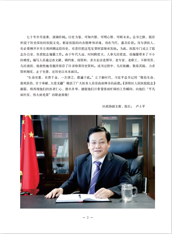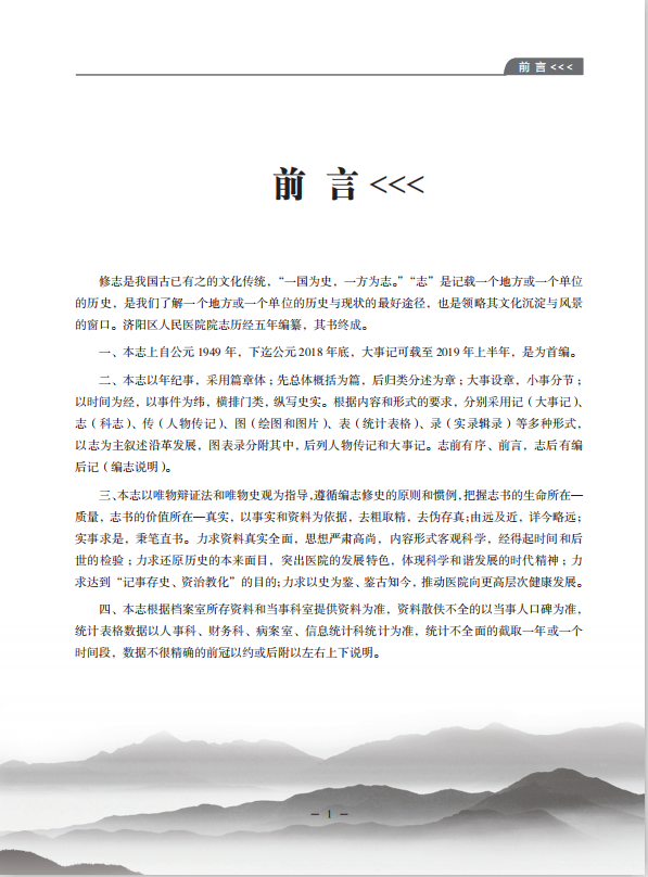“一国为史,一方为志。”“志”是记载一个地方或一个单位的历史,是我们了解一个地方或一个单位的历史与现状的最好途径,也是领略其文化沉淀与风景的窗口。盛世修志是我国古已有之的文化传统,以史为鉴,可知兴替,可明心智,可昭未来。志书之修,提存积淀于历史深处的医院文化,彰显医院的內在精神和灵魂,功在当代,惠及后世。