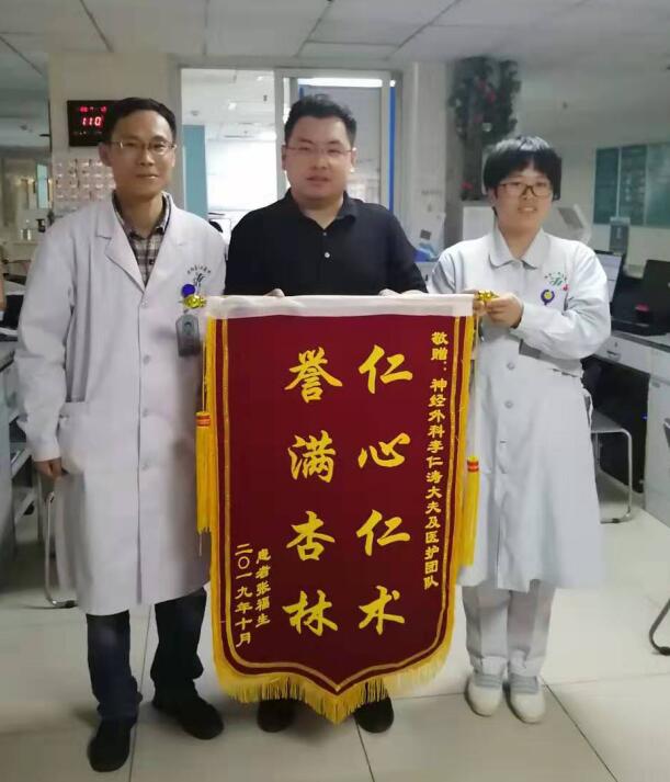 近日,神经外科连收两面锦旗,一面敬科主任高磊及全体医护人员“精湛医术保健康,高尚医德为患者”,一面赞李仁涛医师“仁心仁术,誉满杏林”,面面锦旗是患者的谢意,也是医护人员不断努力的动力。